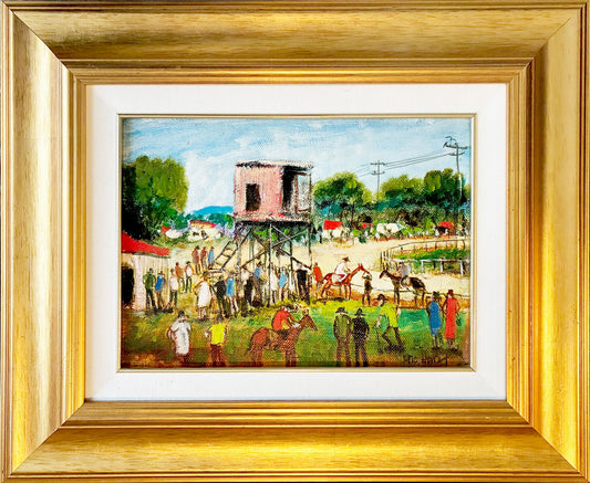 Pro Hart (1928-2006) - Large Original Oil Painting On Board 'Before the Race' 21cm x 29cm