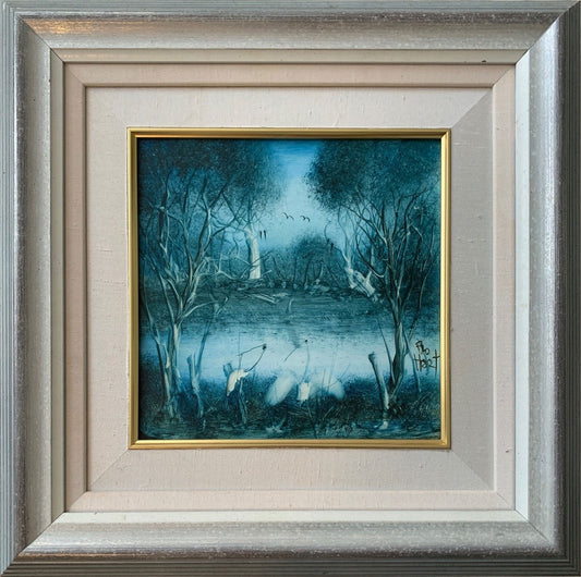 Pro Hart (1928-2006) - Large Original Oil Painting On Board 'Cranes' 29cm x 29cm