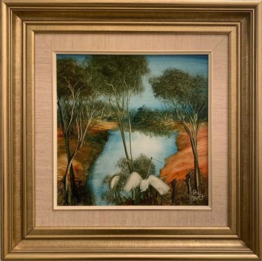 Pro Hart (1928-2006) - Large Original Oil Painting On Board 'Swamp Birds' 29cm x 29cm