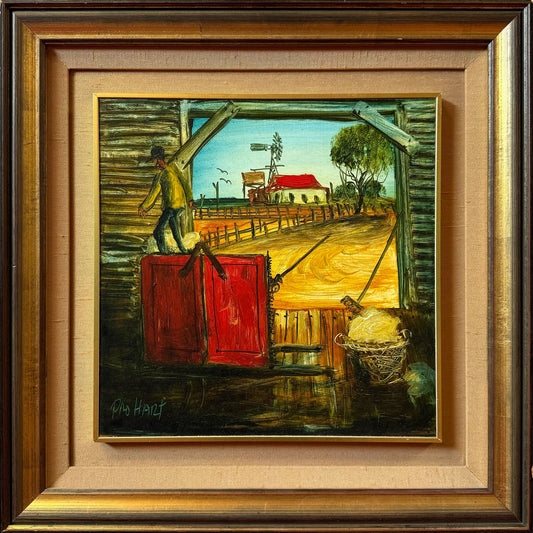Pro Hart (1928-2006) - Large Original Oil Painting On Board 'The Woolpresser' 29.5cm x 29.5cm