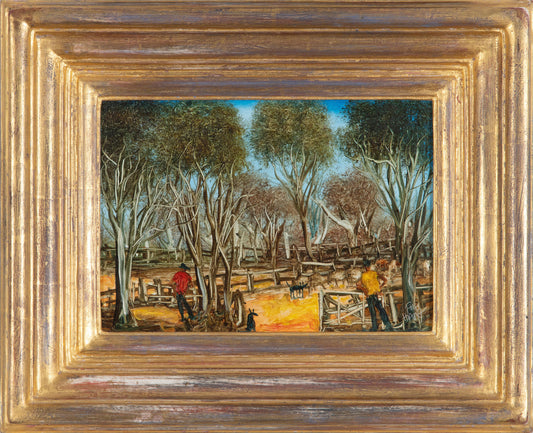 Pro Hart (1928-2006) - Original Oil Painting On Board 'Sheep Yards' - 20.5cm x 29.5cm