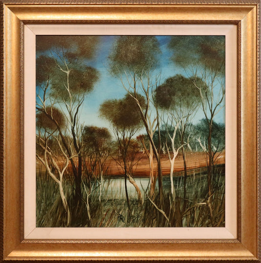 Pro Hart (1928-2006) - Original Oil Painting On Board 'Landscape With Gully" 18.5cm x 18.5cm