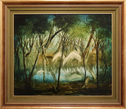 Pro Hart (1928-2006) XLarge Original Oil Painting On Board 'Waterbirds - 3' 49.5cm x 59.5cm