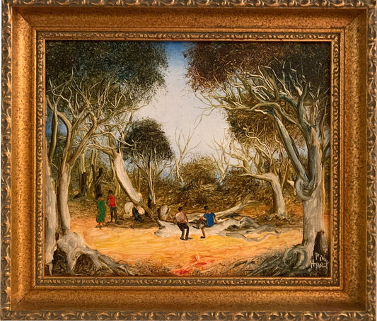 Pro Hart (1928-2006) - Large Original Oil Painting On Board 'Camp Site' - 23.5cm x 29cm