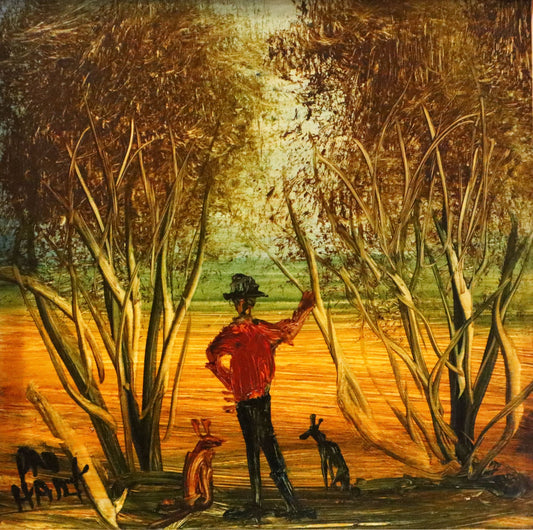 Pro Hart (1928-2006) - Original Oil Painting On Board 'Digging in the Bush' - 20cm x 19.5cm