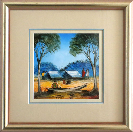 Pro Hart (1928-2006) - Original Oil Painting On Board 'Favourite Camping Spot' - 19.5cm x 19.5cm