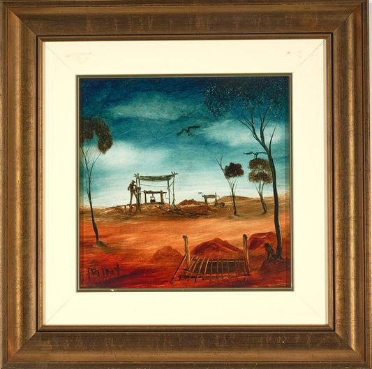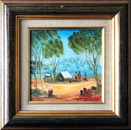Pro Hart (1928-2006) - Original Oil Painting On Board 'Miners Camp' - 19.5cm x 19.5cm