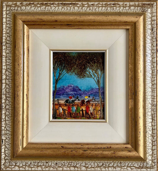 Pro Hart (1928-2006) - Original Oil Painting On Board 'The Horse Race' - 14.25cm x 11cm