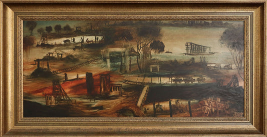 Pro Hart (1928-2006) - Very Large Original Oil Painting On Board 'Mining Scene' 29.5cm x 69cm
