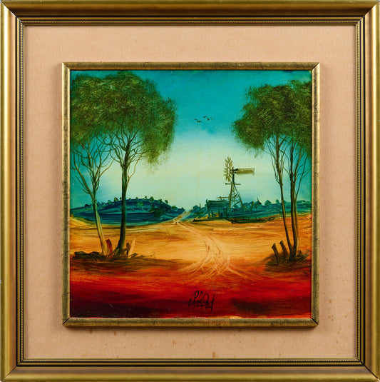 Pro Hart (1928-2006) Original Oil Painting on Board "Outback Landscape" - 19cm x 19cm