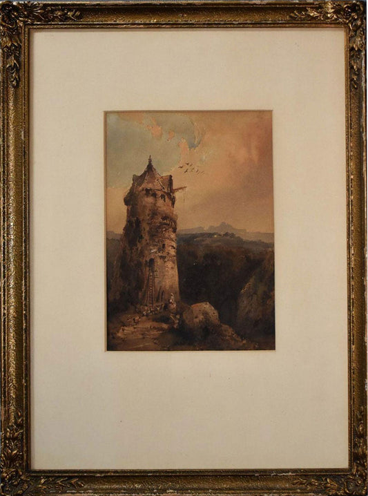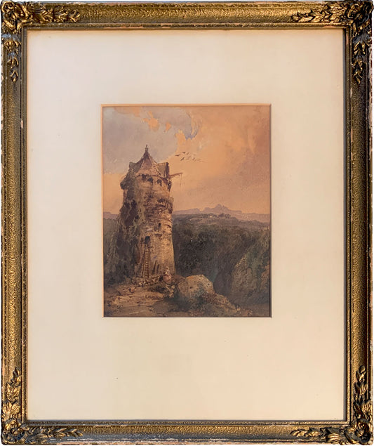 Louis Buvelot (1814-1888) Original Watercolour Painting "Watchtower in a Swiss Landscape" 26.5cm x 20.5cm