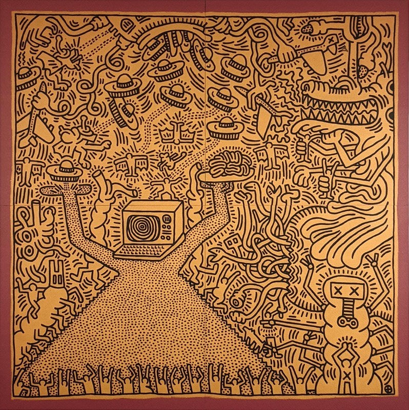 Keith Haring was an American artist and social activist known for his illustrative depictions of figures and symbols. His white chalk drawings could often been found on the blank poster marquees in New York’s public spaces and subways. “I don't think art is propaganda,” he once stated. “It should be something that liberates the soul, provokes the imagination and encourages people to go further. It celebrates humanity instead of manipulating it.”