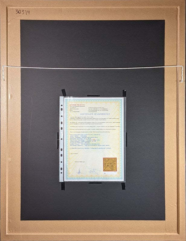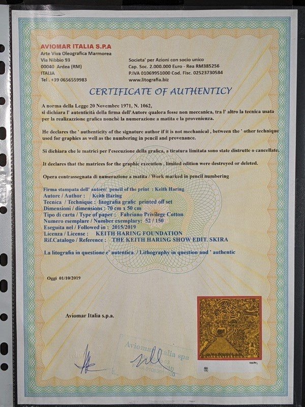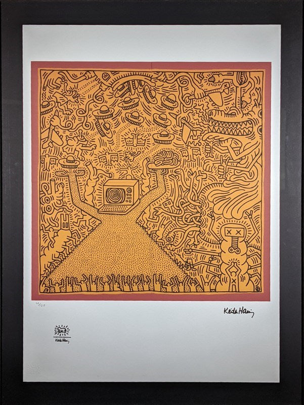 Keith Haring (1958-1990). Large offset limited edition lithograph. Titled "Untitled", 2019. Image Size: 70cm x 50cm Frame Size: 85cm x 65cm Edition: 52/150. Signature Details: Signed Lower Right In Print, Official embossed Haring Foundation stamp, Accompanied By A Certificate Of Authenticity. Condition: Excellent. This is a genuine Haring collectors edition piece.