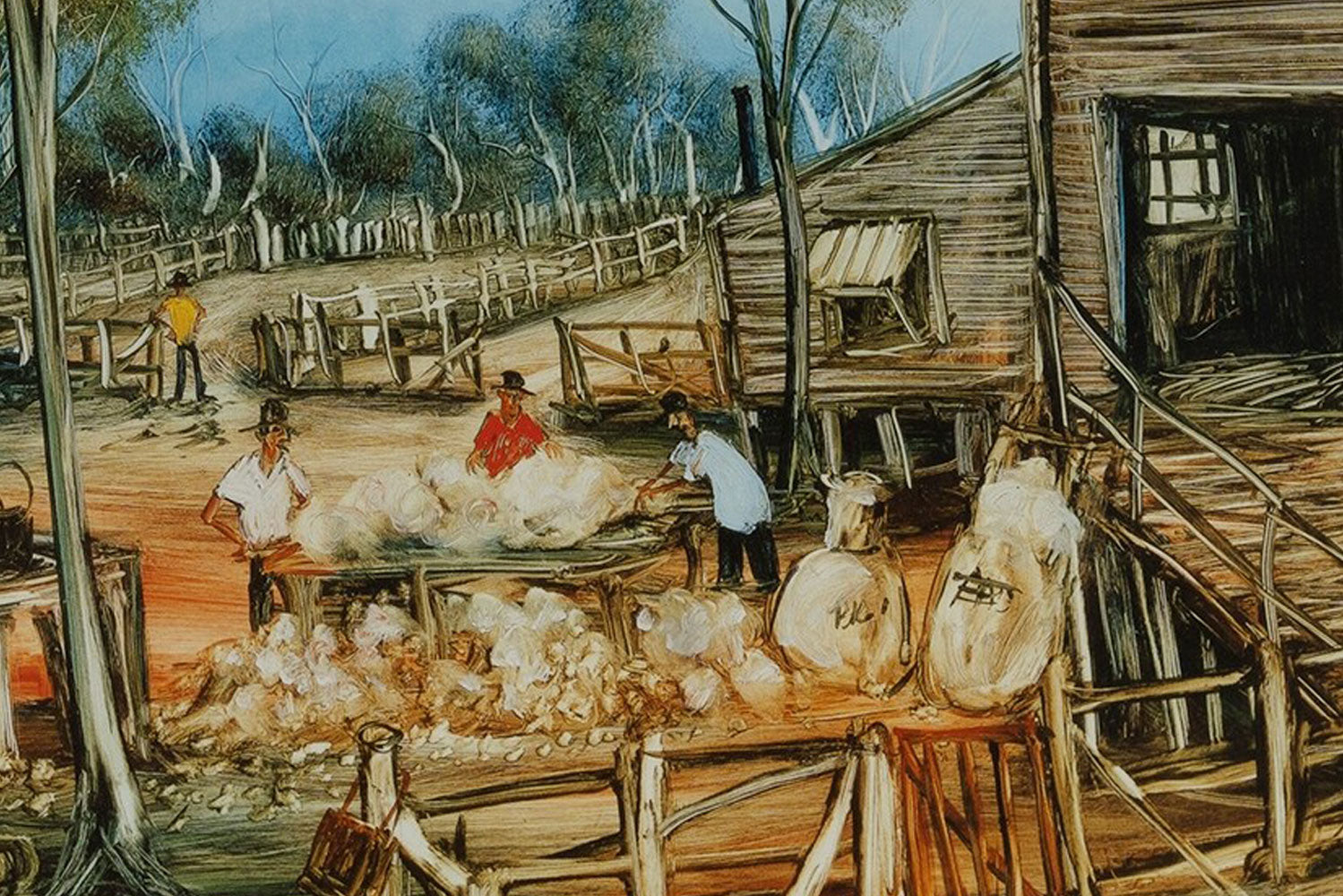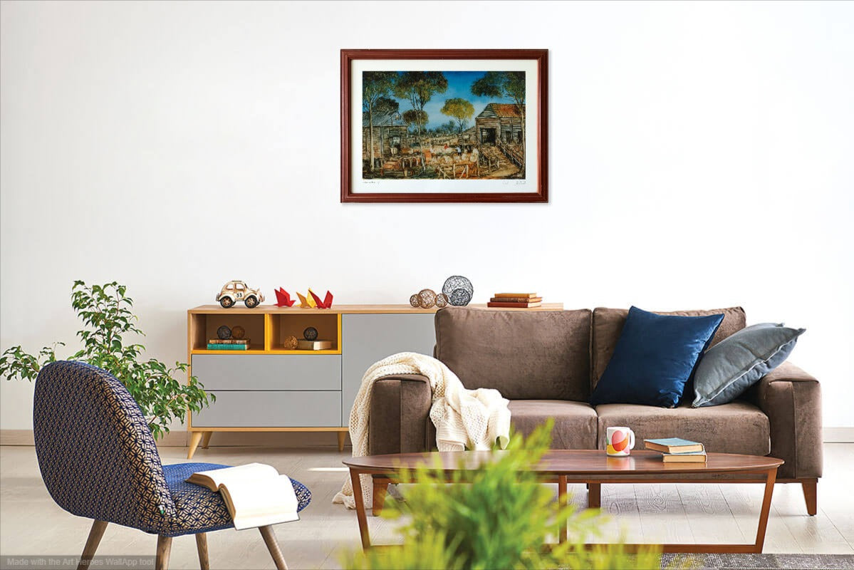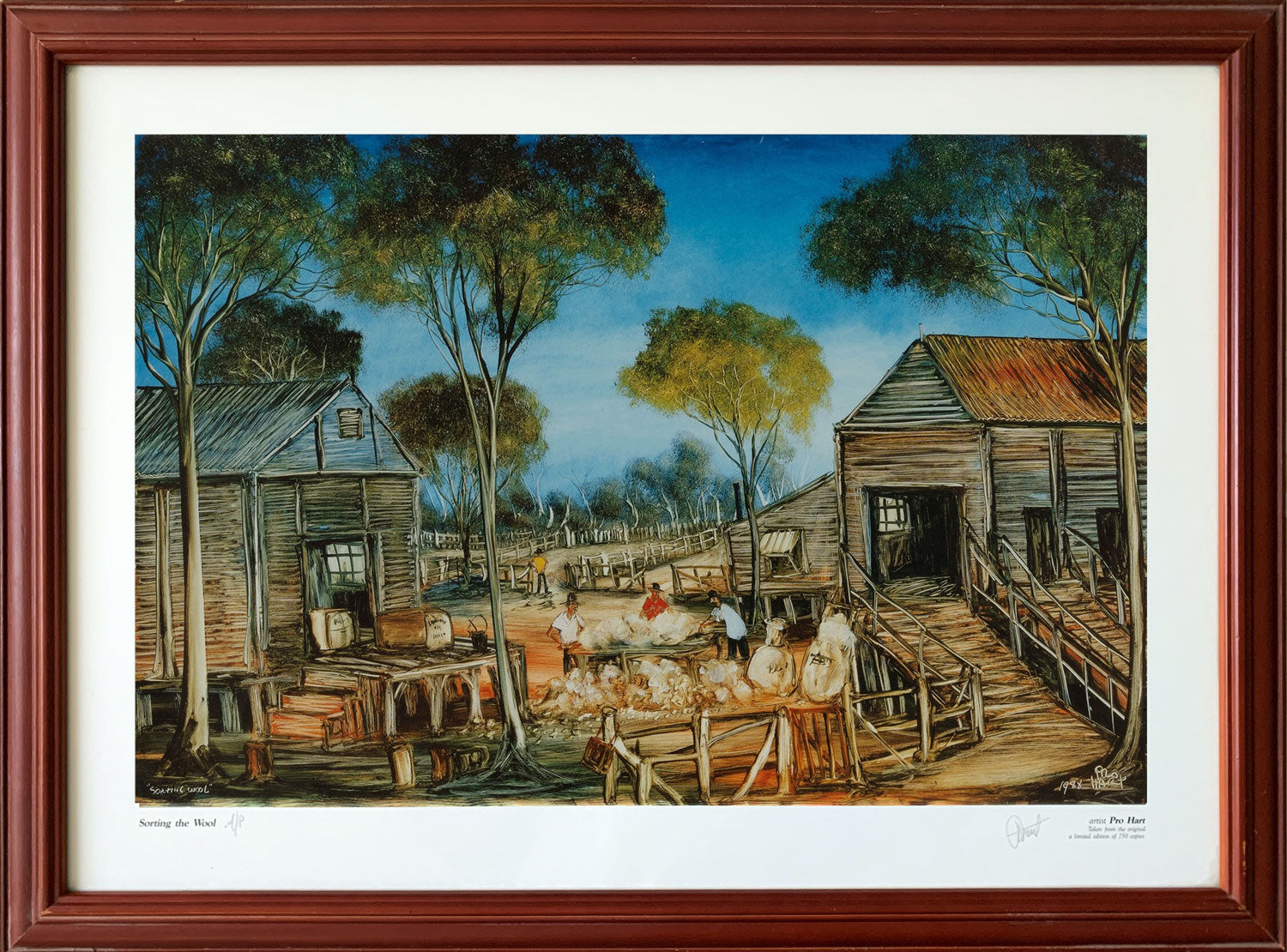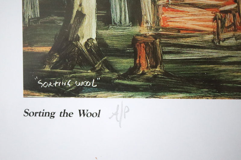 Kevin Charles (Pro) Hart, (1928 - 2006). Large hand signed limited edition print titled 'Sorting the Wool'. Artist proof edition signed in pencil lower right. Nicely framed in red wood under glass. Both the artwork and frame are in excellent condition.